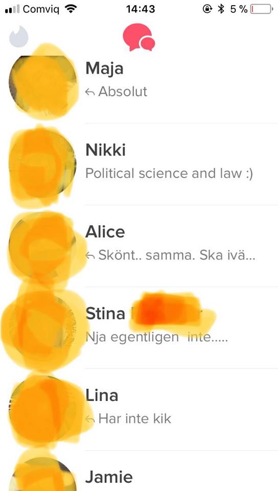 [[{"fid":"6635","view_mode":"wysiwyg","fields":{"format":"wysiwyg","field_file_image_alt_text[und][0][value]":"bild på små delar av några konversationer på tinder.","field_bildtext[und][0][value]":""},"type":"media","field_deltas":{"1":{"format":"wysiwyg","field_file_image_alt_text[und][0][value]":"bild på små delar av några konversationer på tinder.","field_bildtext[und][0][value]":""}},"attributes":{"alt":"bild på små delar av några konversationer på tinder.","class":"media-element file-wysiwyg","data-delta":"1"}}]]